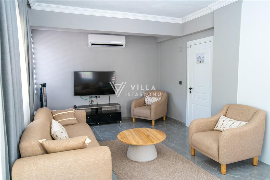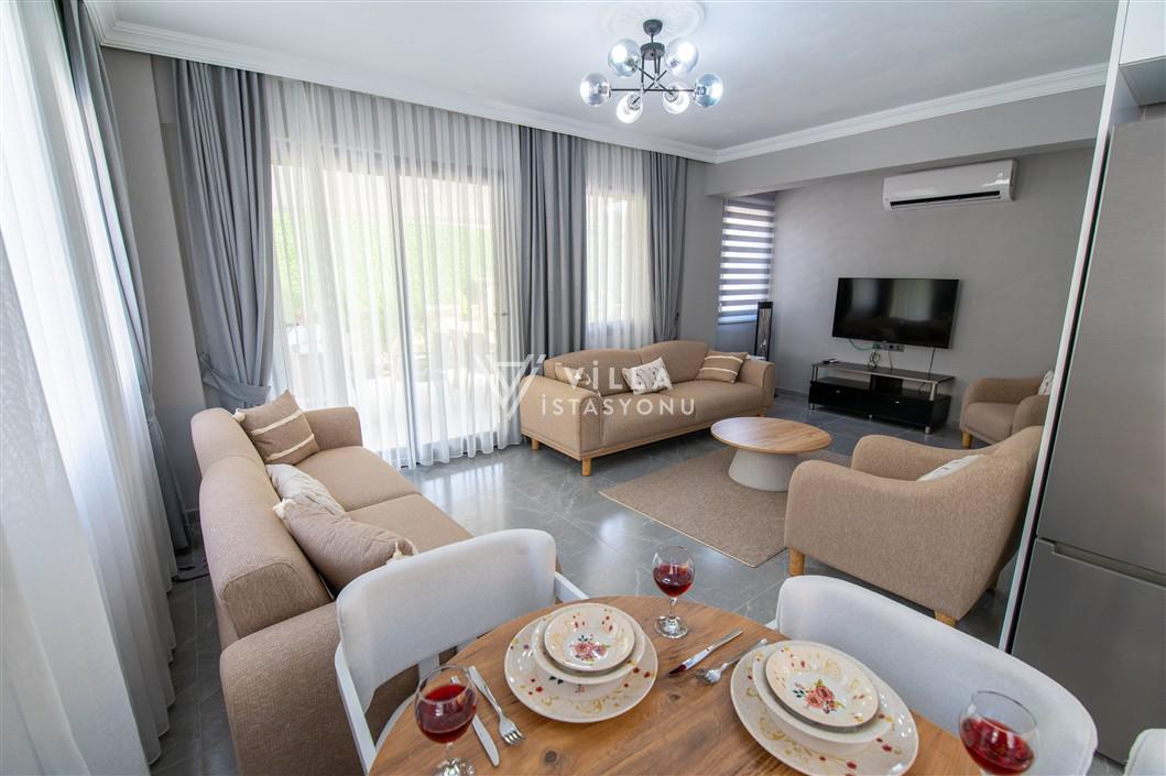 Salon : Zevkle tasarlanmış salonumuzda oturma grubu, TV, orta sehpa, klima, internet erişimi için wi-fi, havuz terasına çıkış bulunmaktadır.
