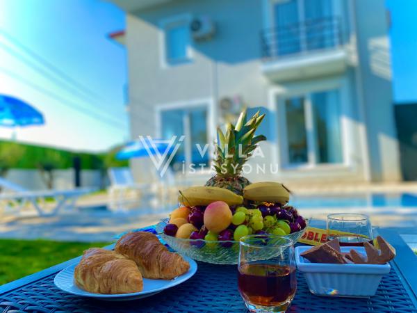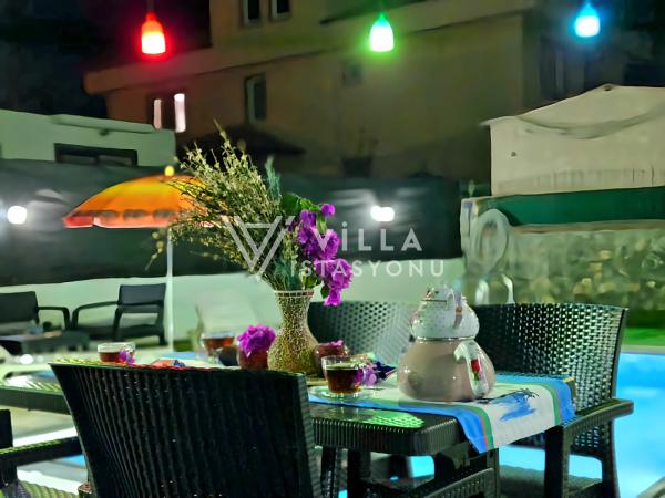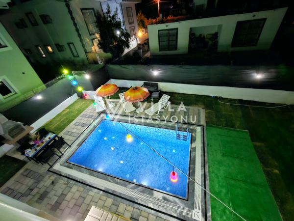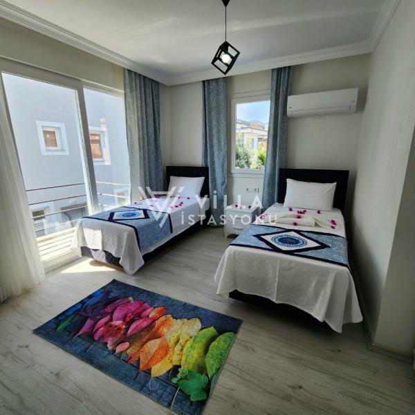 Villamız 2 yatak odalı 2 wc+banyolu 4 kişi kapasiteli, Çalış Plajı'na araç ile 4-5 Dk mesafede bir tatil villasıdır. Geniş bahçe alanı, kullanışlı barbekü ve ideal havuz ölçüleri ile (3m*5m en boy ve 1.55m derinlik) keyifli bir tatil fırsatı sunmaktadır. Giriş kat sadece salon - mutfak ve ortak kullanım WC 'den oluşmakta üst katlar ise,