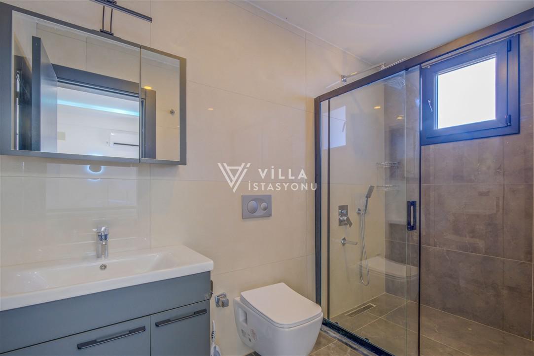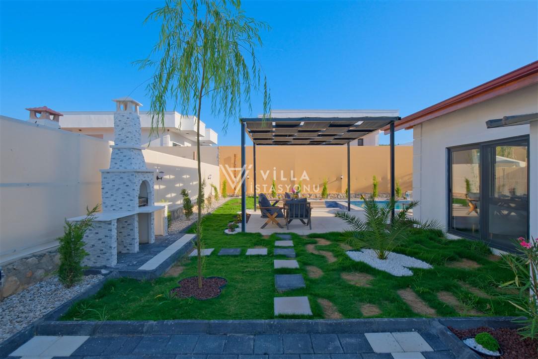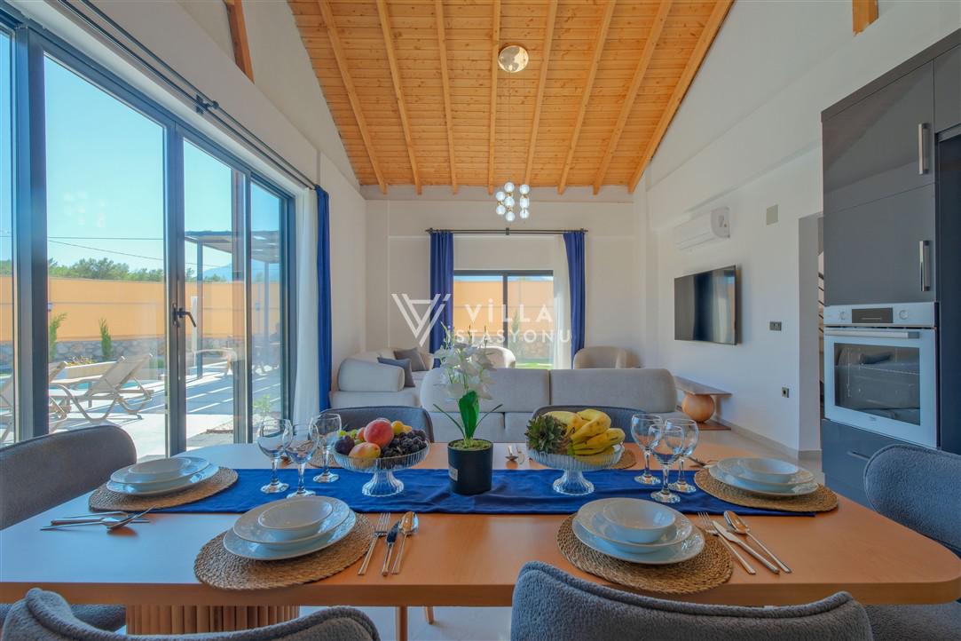 Salon: Özenle döşenmiş açık mutfaklı salon, modern koltuklar, 6 kişilik yemek masası, Lcd tv, uydu alıcısı ve klima bulunmaktadır. Salondan havuz ve bahçeye açılan kapısı mevcuttur.