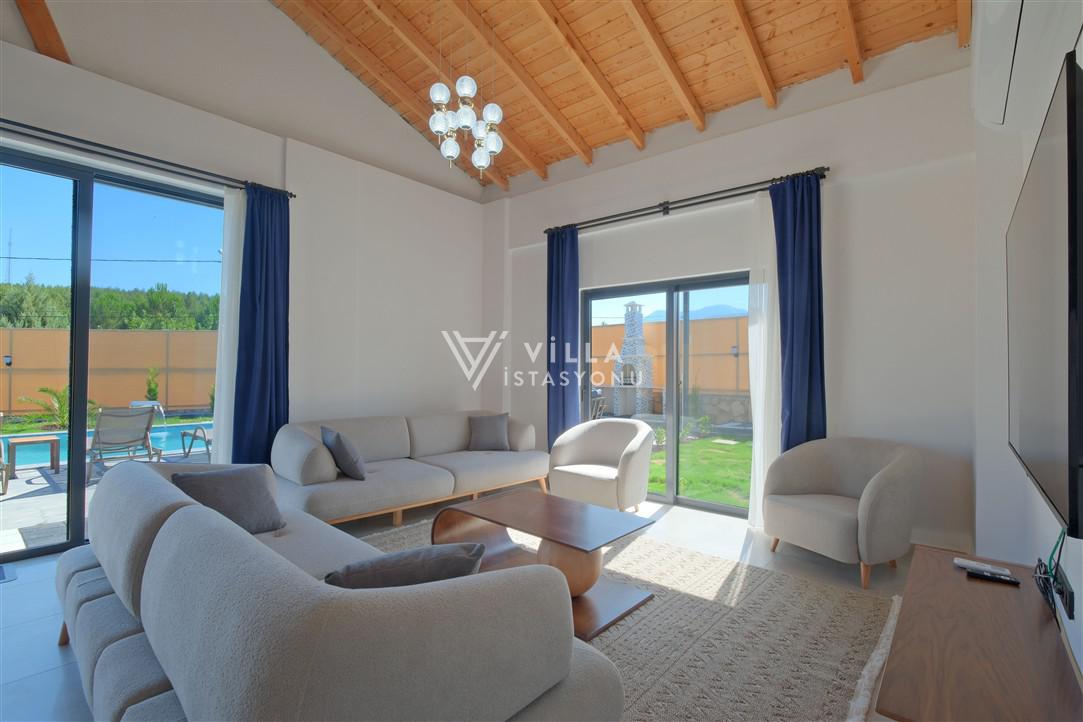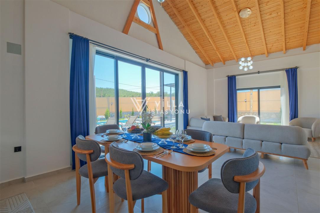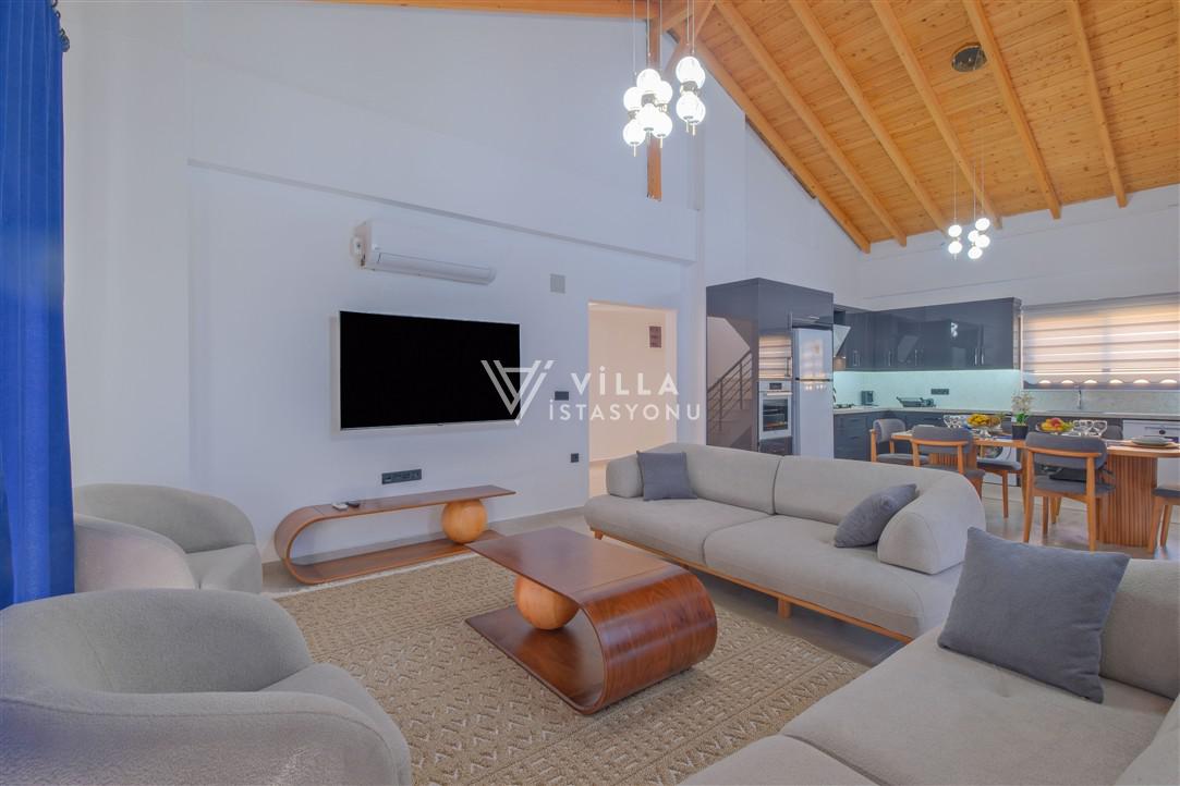 Salon: Özenle döşenmiş açık mutfaklı salon, modern koltuklar, 6 kişilik yemek masası, Lcd tv, uydu alıcısı ve klima bulunmaktadır. Salondan havuz ve bahçeye açılan kapısı mevcuttur.