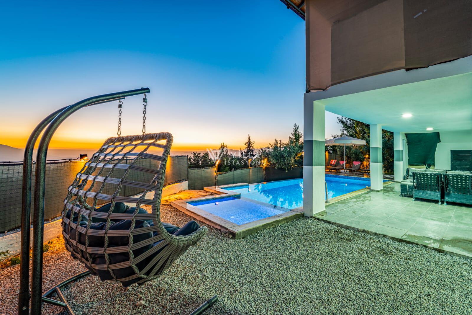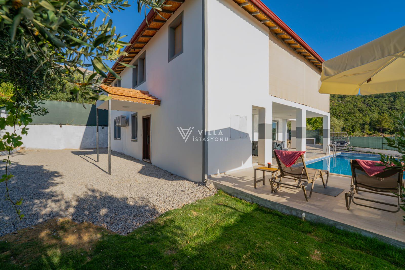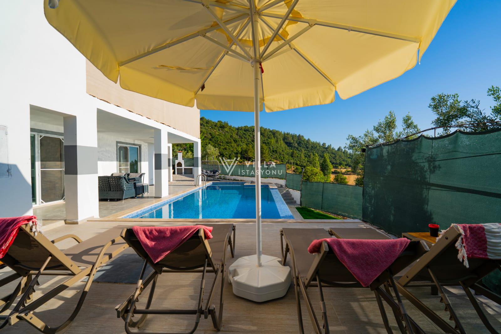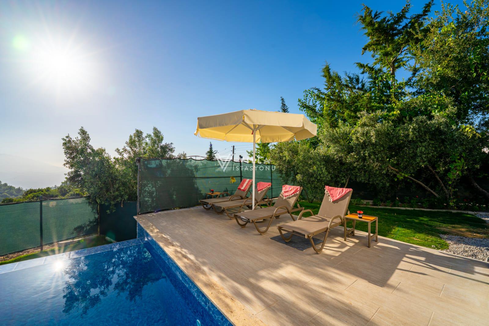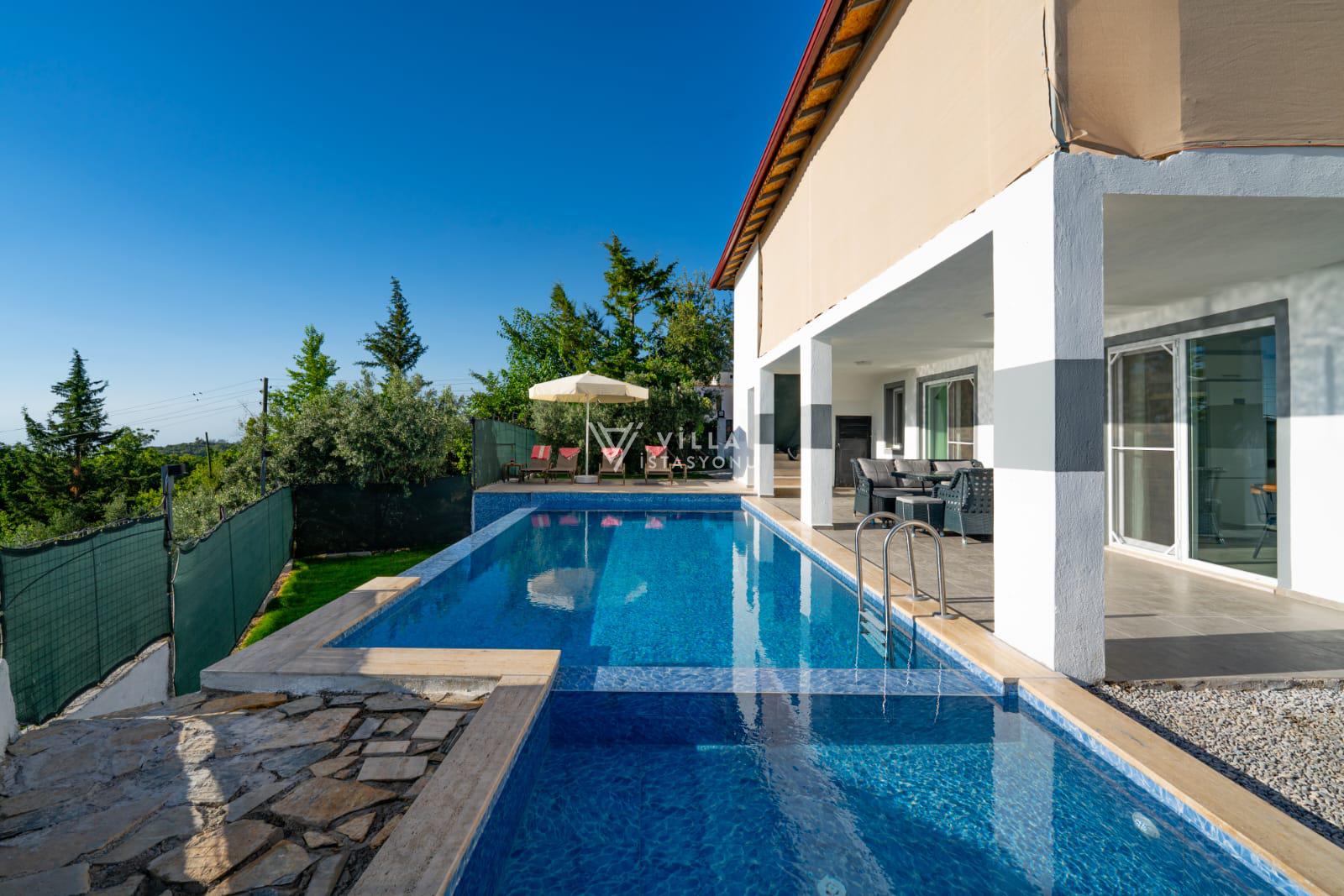 Doğa içerisinde konumlu villamızın havuz alanı ve bahçesi korunaklı hale getirilmiştir ve dışarıdan görünmemektedir.