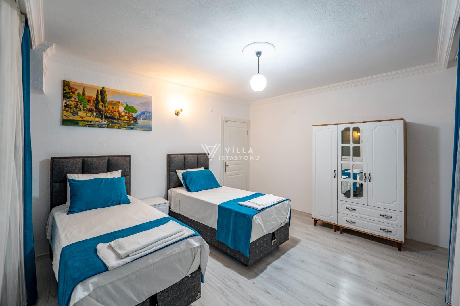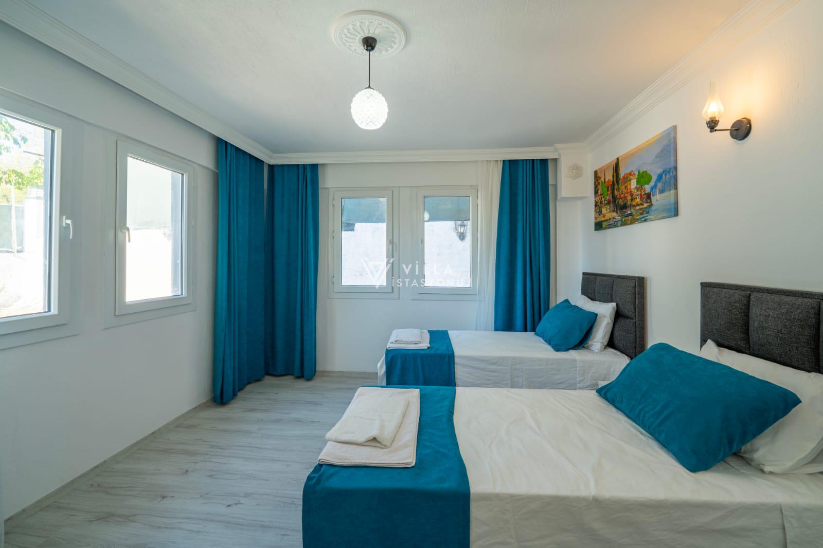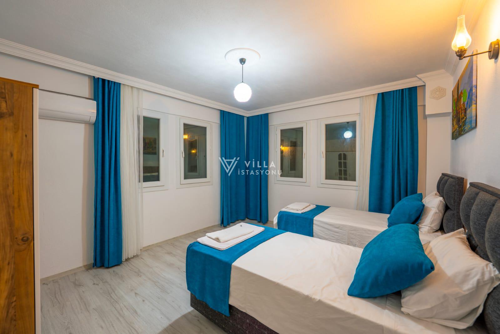 İki yatak odalı villamız 4 kişiye kadar konaklama imkanı sunmaktadır. 1 adet çift kişilik ve 2 adet tek kişilik yataktan oluşan villamızın ebeveyn yatak odasında özel banyo tuvalet mevcuttur. Genç yatak odasının banyo tuvaleti ise koridor kısmında bulunmaktadır.