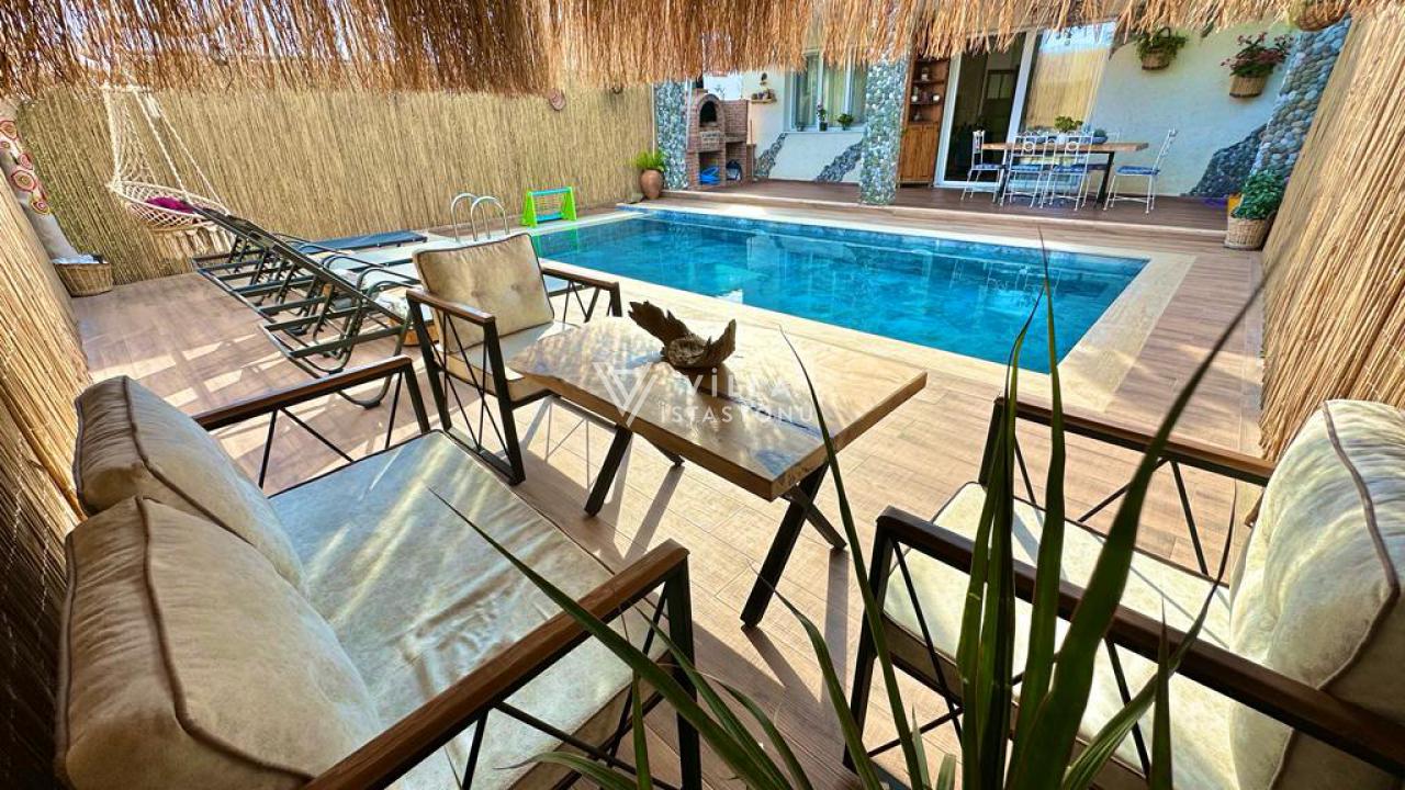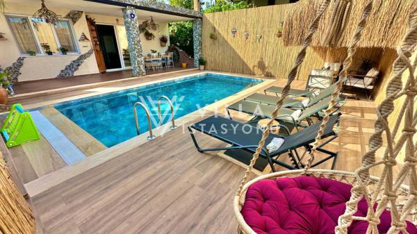 Doğa içinde bulunan villada kapasiteye uygun oturma alanı, şezlong takımı, barbekü alanı, çocuk oyun alanı ve salıncak; havuz terasına açılan konforlu oturma odası, ihtiyaçlarınızı karşılayacak donanımlı mutfağı bulunmaktadır. İki yatak odasında da çift kişilik yatak ve ebeveyn banyosu bulunmakta olup, villa otantik ve nostaljik detaylarıyla sizlere keyifli bir tatil imkanı sunmaktadır.