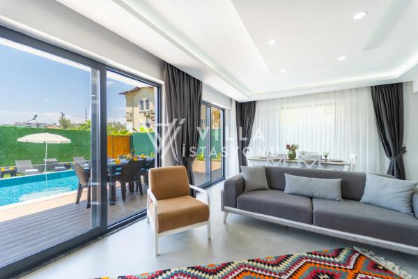 Salon: Açık mutfaklı salon, oturma grubu, Led tv, uydu alıcısı ve klima bulunmaktadır. Salondan havuz ve bahçeye çıkış kapısı vardır.