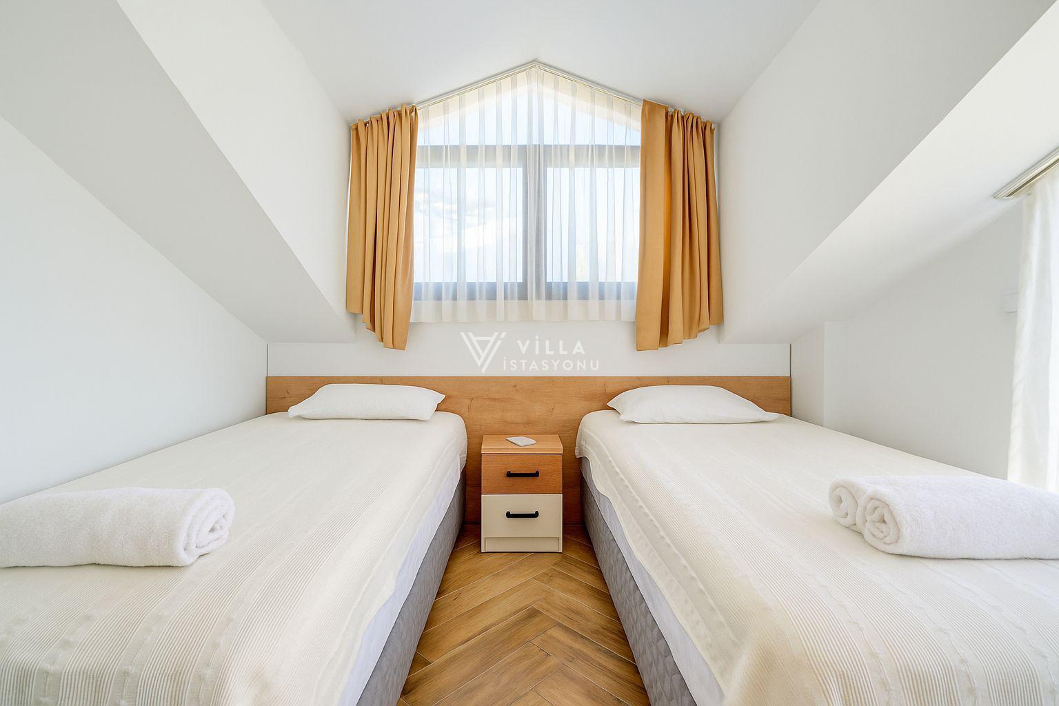 4. Yatak Odası : 2 adet tek kişilik yatak, klima, komidin, elbise dolabı, banyo / wc