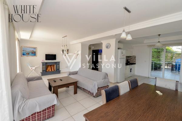 Salon : Oturma odamız oturma grubu, klima, LCD TV, sehpa ve uydu alıcı ile donatılmıştır. Villamızın havuz terasına doğrudan çıkış yapabilirsiniz.